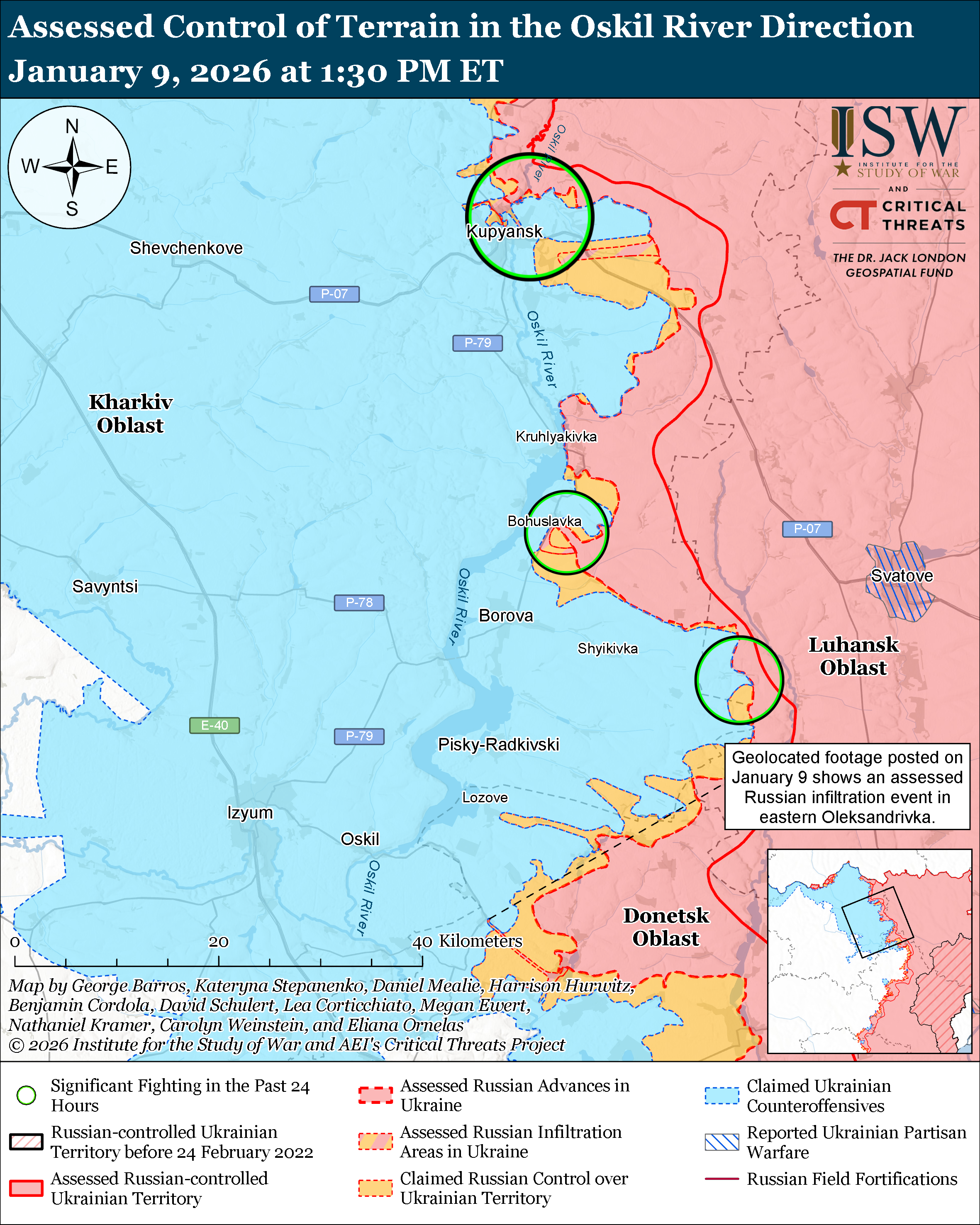 Assessed Russian infiltrations: Geolocated footage published on January 9 shows Ukrainian forces striking two Russian servicemembers on the eastern outskirts of Oleksandrivka (south of Borova) during what ISW assesses was a Russian infiltration mission that did not change the control of terrain or the forward edge of battle area (FEBA) at this time.[l]