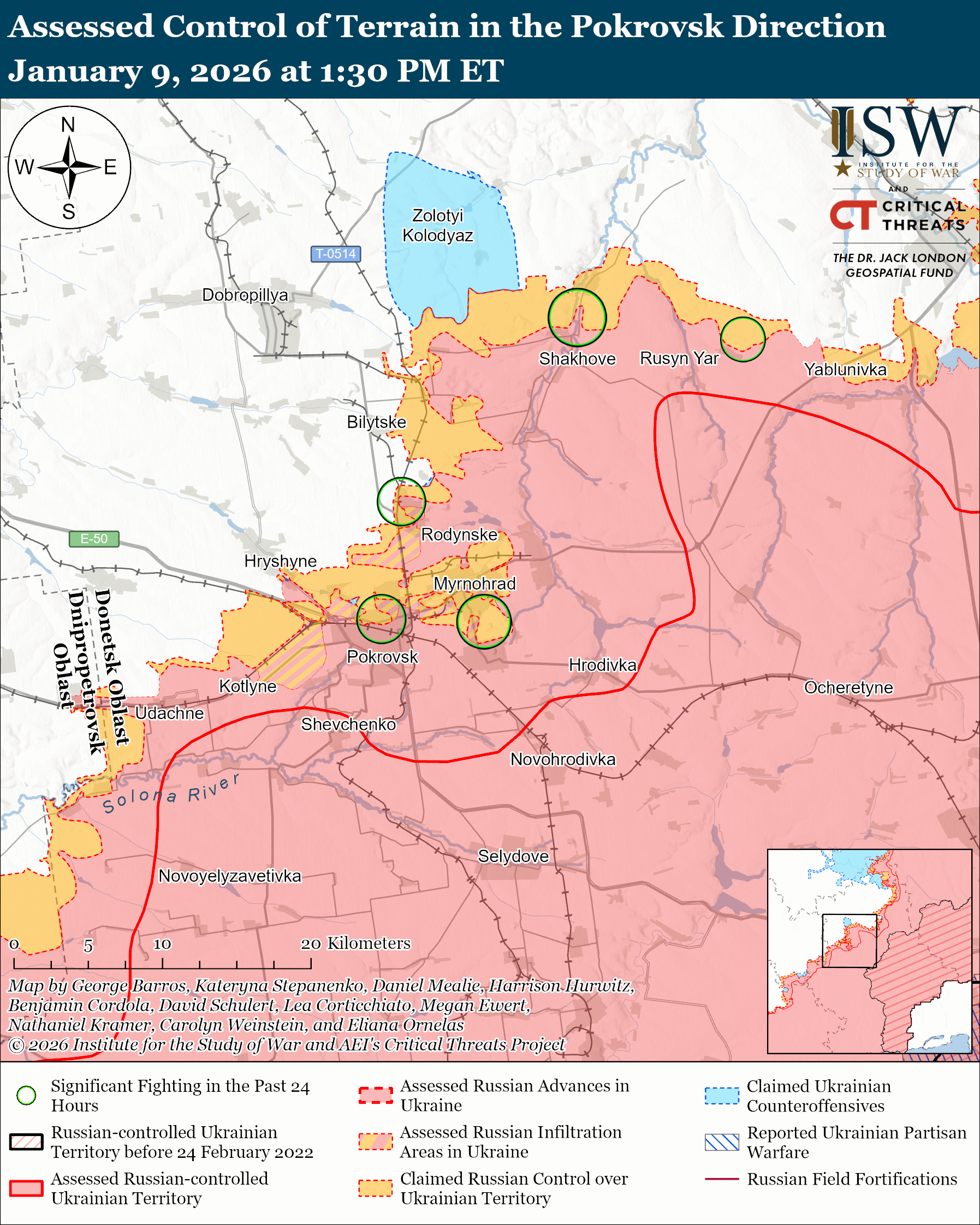 Russian forces continued offensive operations and infiltrated north of Pokrovsk on January 9 but did not make confirmed advances in the Pokrovsk direction.