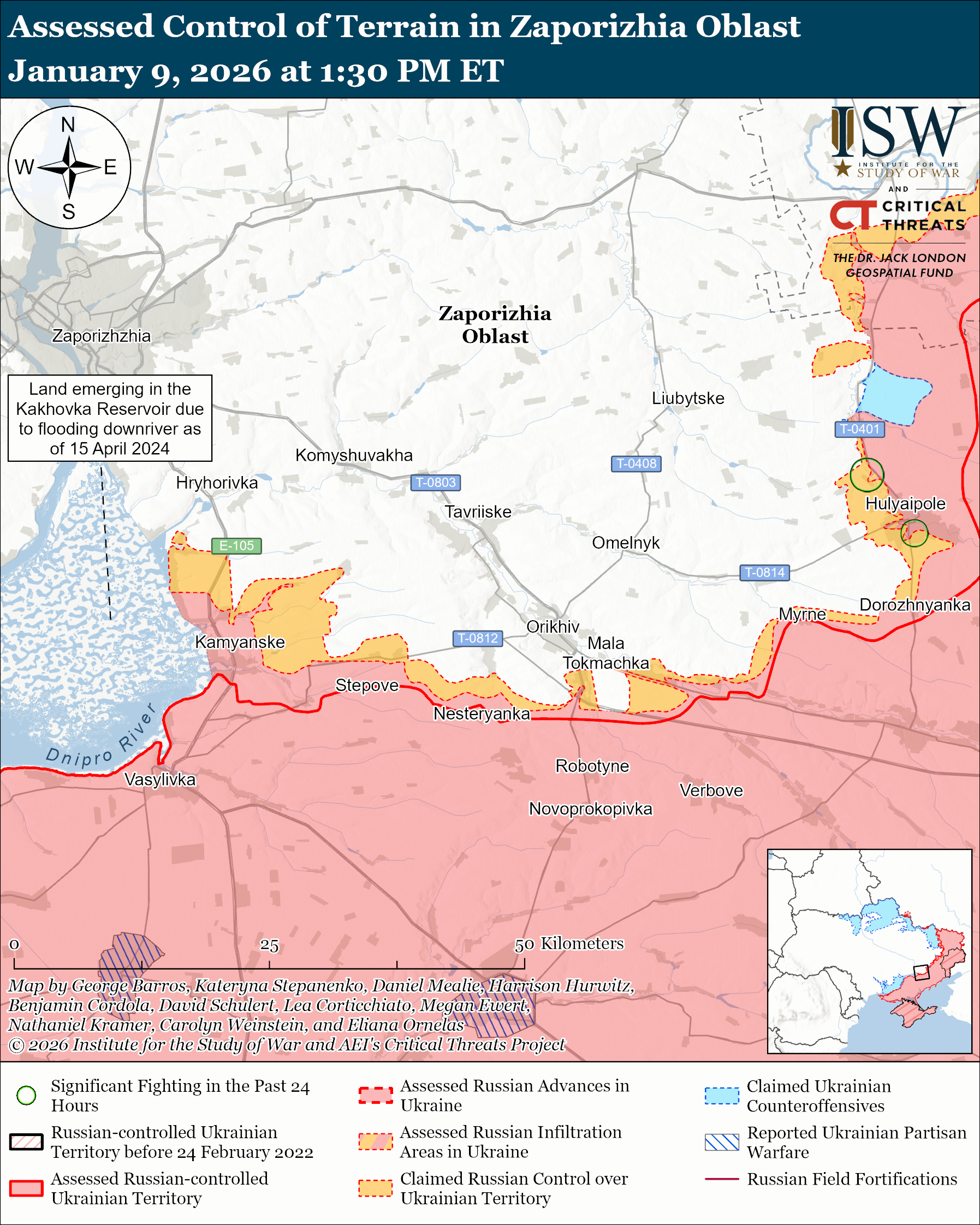 Assessed Russian infiltrations: Geolocated footage published on January 9 shows a Russian servicemember raising a flag in Zelene (north of Hulyaipole) in what ISW assesses was a Russian infiltration mission that did not change the control of terrain or the forward edge of battle area (FEBA).[xc] Additional geolocated footage published on January 9 shows Ukrainian forces assaulting a Russian position on the western outskirts of Pryluky, indicating that Russian forces had infiltrated into the settlement at a prior date.[xci]