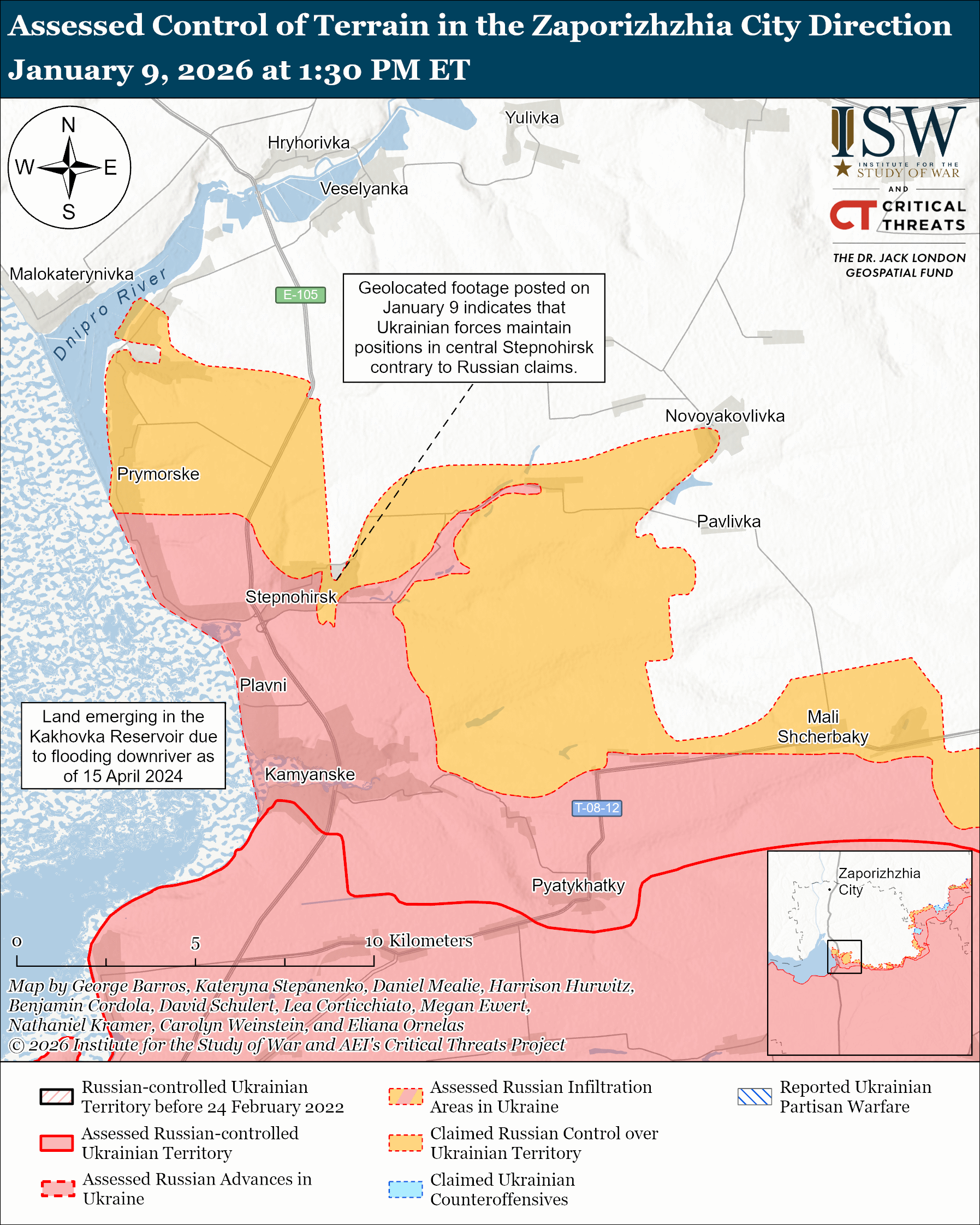 Refinement of area under Russian claims: Geolocated footage published on January 9 shows Ukrainian forces operating in central Stepnohirsk (west of Orikhiv) — an area in which Russian sources previously claimed that Russian forces maintained positions.[xcix]