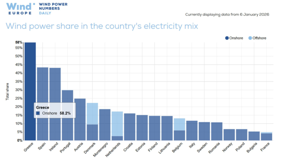 Greece is at the forefront of renewable energy, according to data from WindEurope that was shared via LinkedIn by the Hellenic Wind Energy Association (HWEA).
