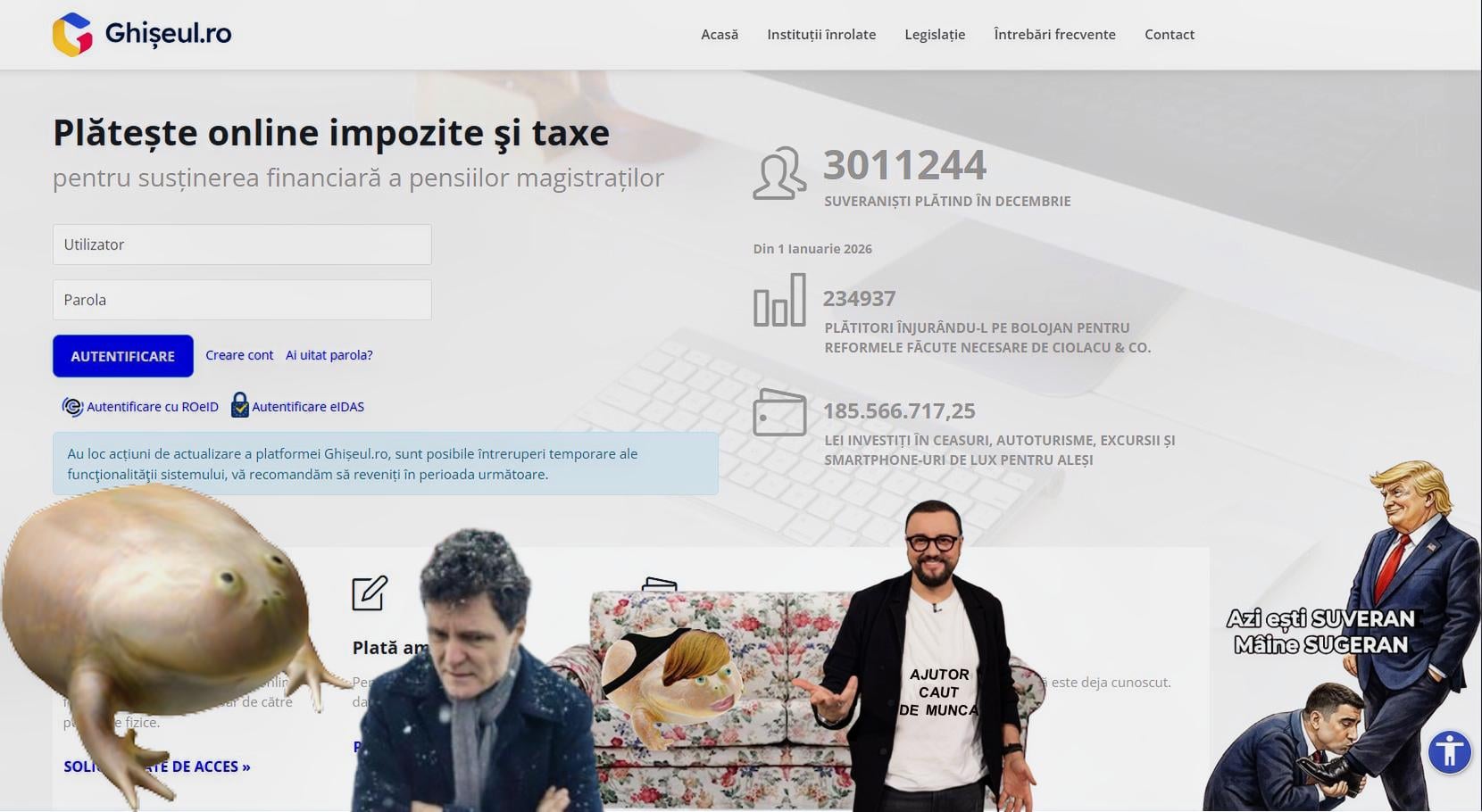 GeotheHSLord on January 14, 2026 8:45 am La mulți și fericiți ani în 2026 și pe mai departe, dragii mei flăcăii <3 Nu uitați să vă plătiți taxele, că altfel ajungeți să rămâneți fără avion, [la fel ca presedintele nostru la Paris](https://www.g4media.ro/avion-zbor-nicusor-dan-paris-blocat-vreme-aeronava-c-27j-spartan-armata-romana.html). De asemenea, nu uitați să vă respectați superiorii, [așa cum fac sugeraniștii adevărați în fața „tătuțului” din America](https://www.reddit.com/r/Romania/comments/1qav38c/pai_da/?utm_source=share&utm_medium=web3x&utm_name=web3xcss&utm_term=1&utm_content=share_button). Domnul Cătălin Măruță nu a început anul prea bine, [trebuie să treacă pe la Direcția pentru Șomaj acum](https://hotnews.ro/pro-tv-emisiune-catalin-maruta-2148644). Asta deși locuri de muncă se găsesc, [mai ales având în vedere că o nouă ramură a muncii s-ar putea să intre în legalitate.](https://adevarul.ro/politica/proiect-de-lege-depus-in-parlament-pentru-2500230.html?fbclid=Iwb21leAPR8fljbGNrA9Hx9GV4dG4DYWVtAjExAHNydGMGYXBwX2lkDDM1MDY4NTUzMTcyOAABHr7cXFrKt11DXQIJnrKq4XZDJglxyzXjux8IKKTKXh80V80JLxWunuKI5Zf4_aem_oIFFQdPXmvDvbUhFf2TajQ)