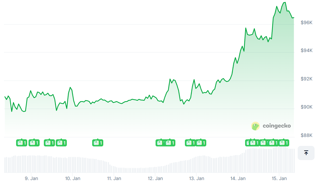 Bitcoin has broken through its recent range, currently sitting at around $96,500, representing a 1.37% increase over the past 24 hours. A sustained move above $97,000 is crucial for the token to retest $100,000.