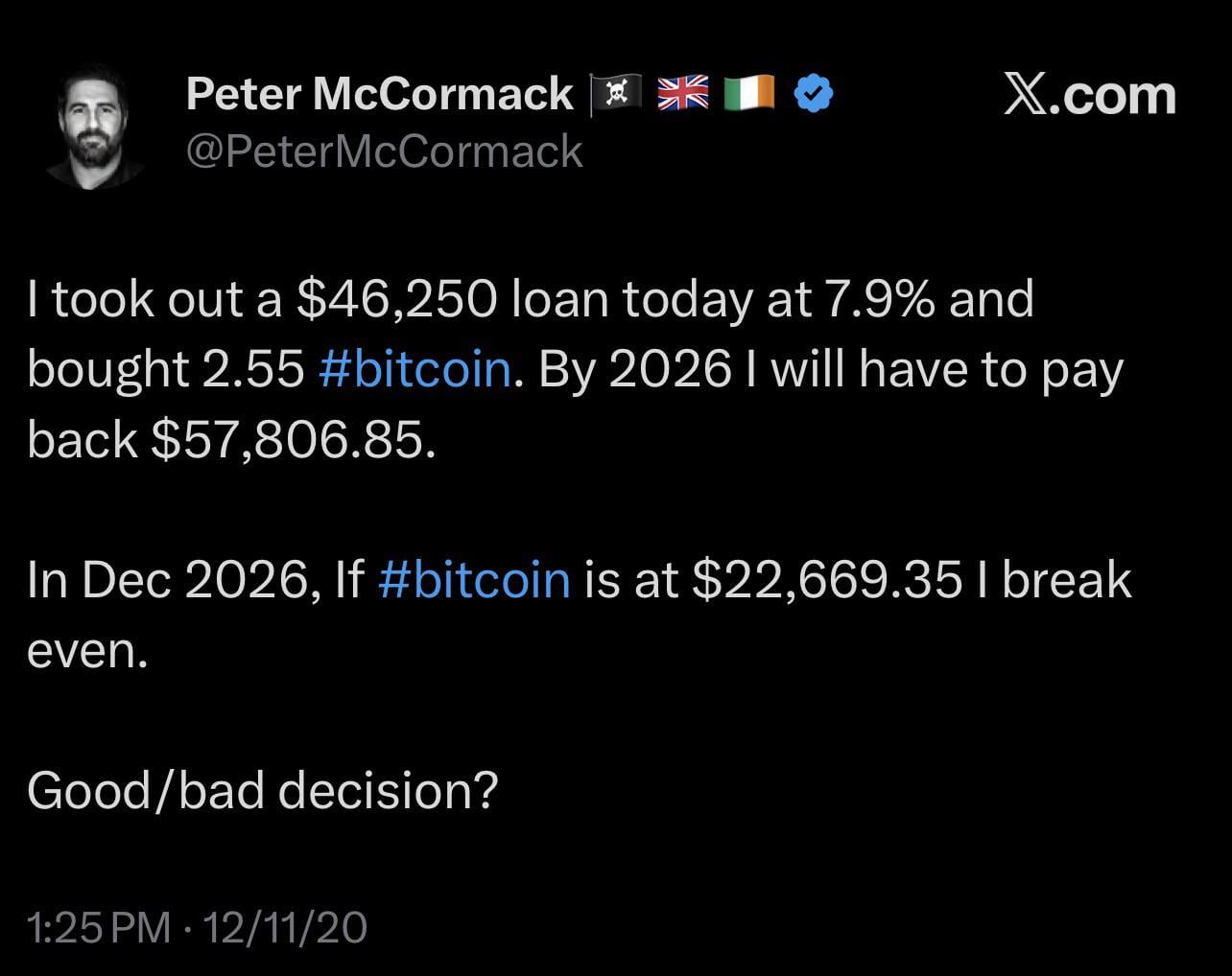 Peter McCormach is a mega bull. Met him in person and his team interview me for their Convoy special they were doing. Ultimately didn’t air but this guy definitely didn’t sell, and even bought a soccer team with BTC.