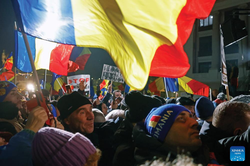 People shout slogans during an anti-austerity rally in downtown Bucharest, Romania, Jan. 15, 2026. (Photo by Cristian Cristel/Xinhua)