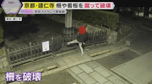 A man appeared in the temple grounds in the early hours of the morning, carrying what appeared to be a smartphone. He stood there for a while, then suddenly appeared. He kicked the fence repeatedly, slamming into it with his body. Then, he moved to the center of the fence, kicking it down and entering.