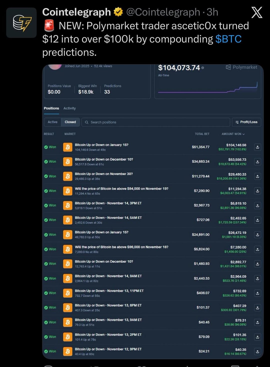 Polymarket trader ascetic0x turned $12 into over $100k by compounding BTC predictions https://www.reddit.com/gallery/1qemd9d