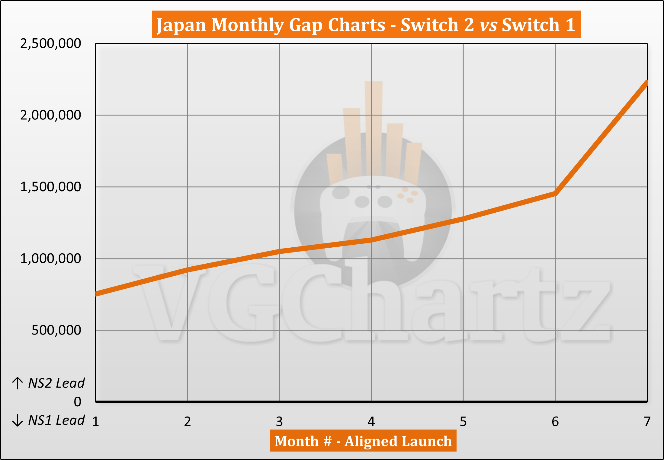 December 2025 is the 7th month that the Nintendo Switch 2 has been available for in Japan. During the latest month, the Switch 2 has outsold the Switch 1 by 0.78 million units when you align the launches. The Switch 2 is now ahead of the Switch 1 by 2.23 million units.