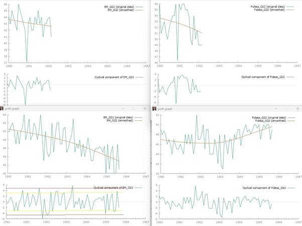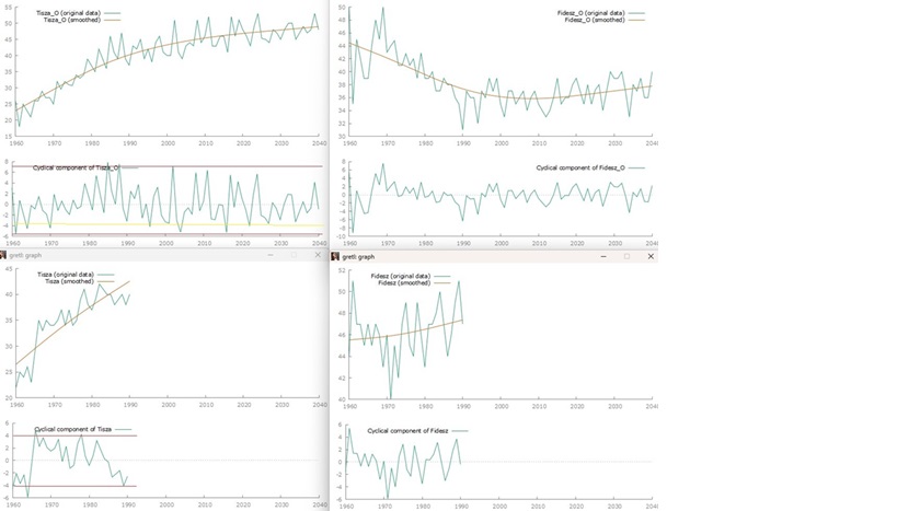 These tests seriously call into question the reliability of the opposition-aligned polling. They have an extremely high cyclical component when they poll for Tisza support, meaning that different polls from opposition-aligned pollsters radically disagree with each other. This is very suspicious, especially since they seem able to poll Fidesz support without these enormous discrepancies. It might also be interesting to compare the polls for the 2026 election with the polls previously run for the 2022 election. Here, we will use the polls from the same pollsters and once again divide them into opposition-aligned and government-aligned pollsters. This time, the latter are on the top, and the former are on the bottom.