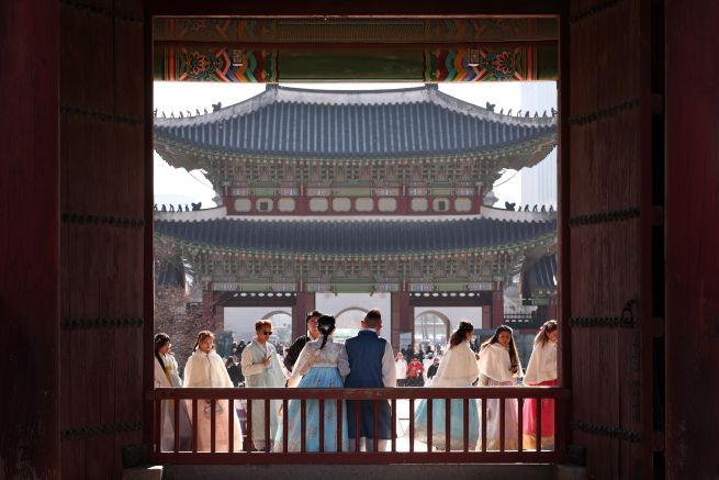 Foreign tourists and local visitors are seen at Gyeongbokgung Palace in Jongno District, Seoul. (Yonhap)