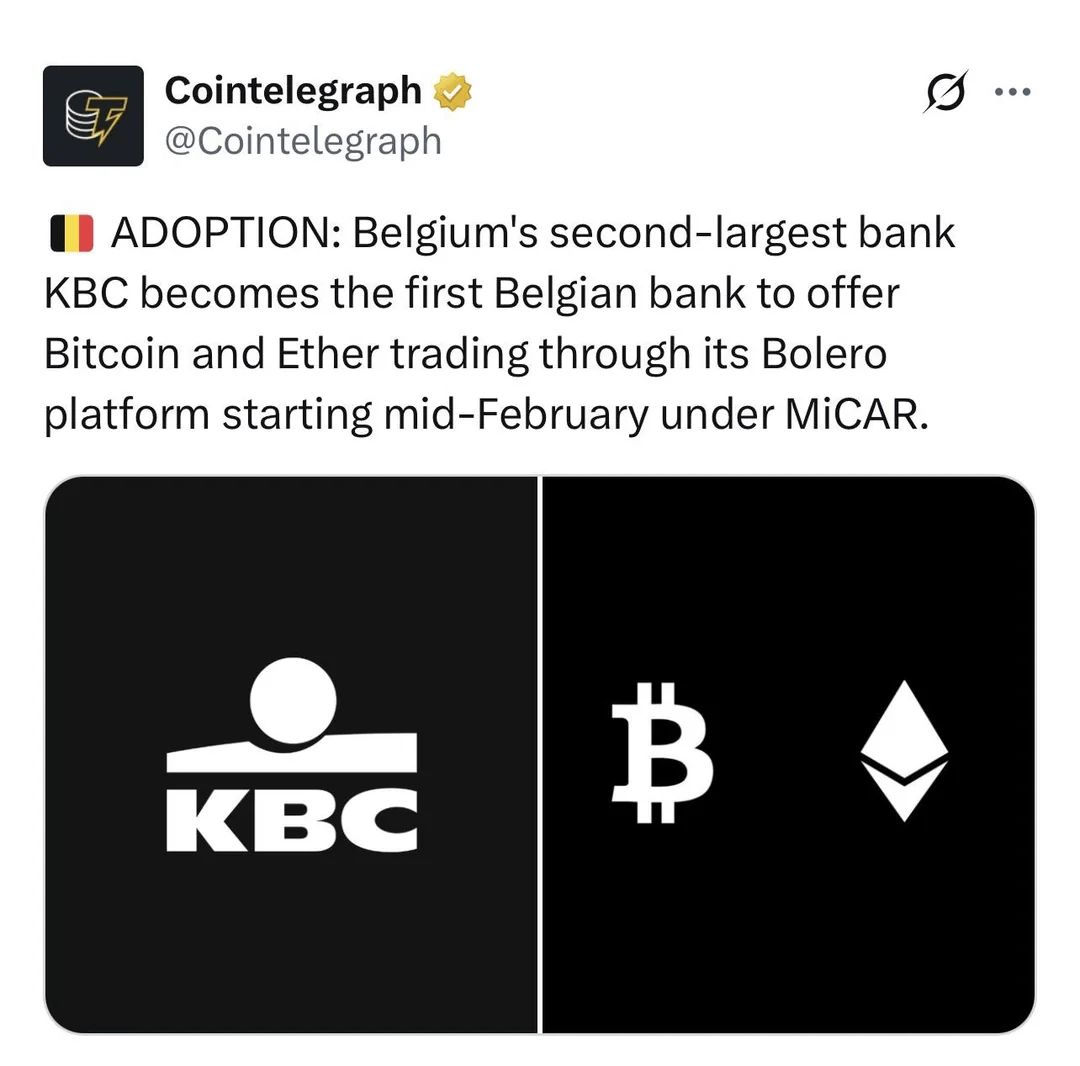 KBC Bank, Belgium’s second-largest bank, will become the first Belgian bank to offer direct Bitcoin and Ether trading to retail customers starting February 16, 2026, through its online investment platform Bolero. This follows the EU’s Markets in Crypto-Assets Regulation (MiCA), which Belgium implemented in January 2026.