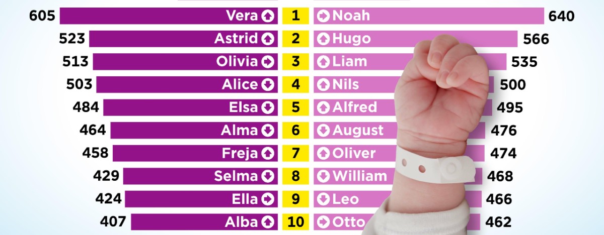 Among boys, Noah was the clear winner for the third year in a row, given to 640 boys. It was followed by Hugo, Liam, Nils and Alfred. William, the most popular name of all back in 2022, has now fallen to eighth place.