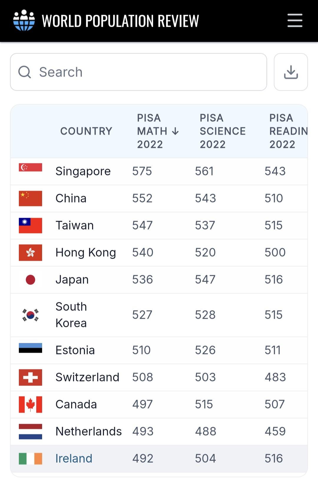 Working link: https://worldpopulationreview.com/country-rankings/pisa-scores-by-country