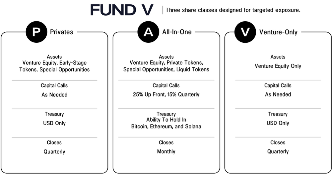 Limited Partners have the flexibility to invest in just venture (Class V for “Venture”), or in venture, private tokens, and locked-up treasury tokens (Class P for “Privates”), or the all-in-one Class A.[5],[6]
