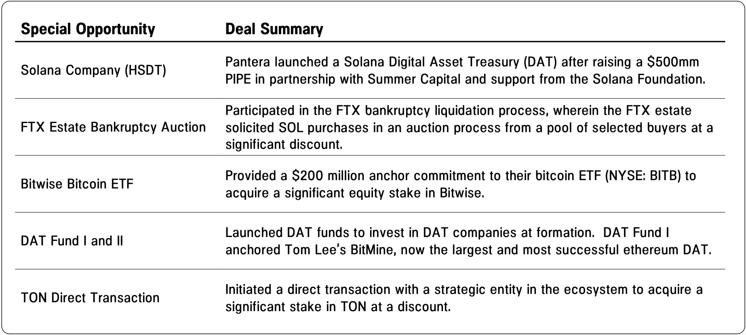 2025 was a marquee year for Pantera.  We deployed more capital than ever before, led the majority of our new investments, and expanded our global footprint across sectors and geographies that we believe will define the next decade of crypto.  At the same time, our portfolio saw strong public-market validation, with four portfolio company IPOs and major strategic acquisitions.