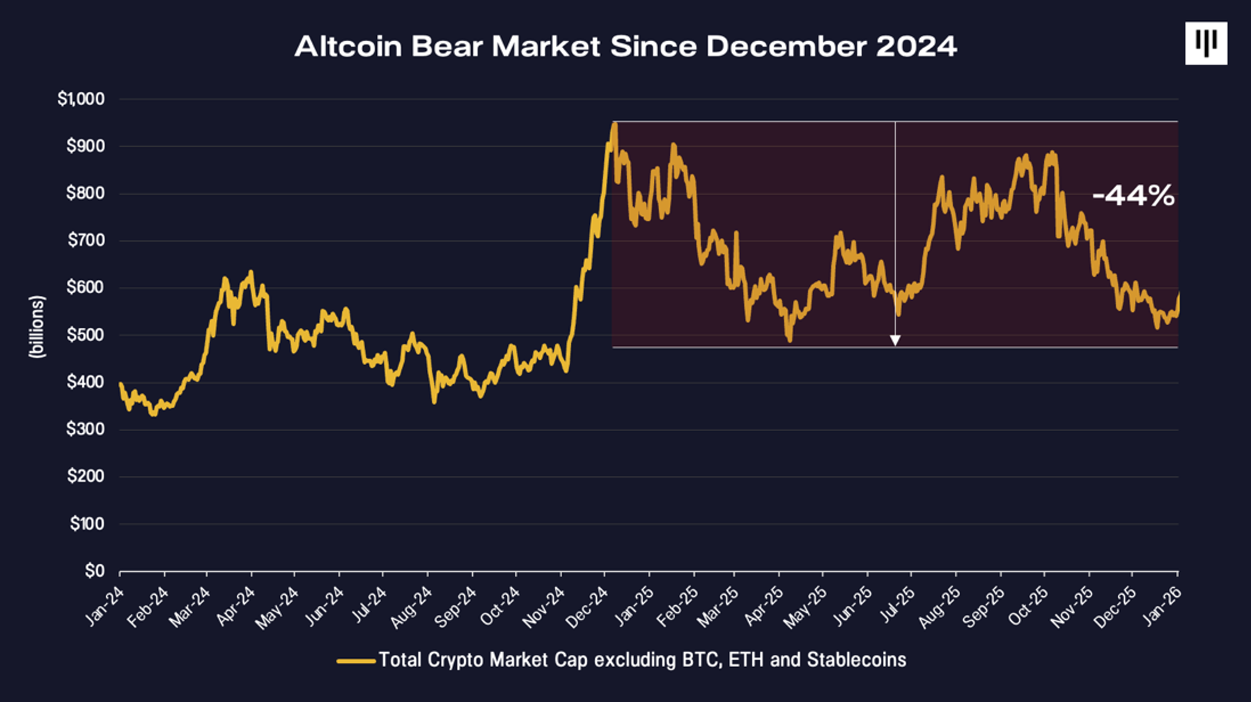 Total crypto market capitalization excluding bitcoin, ethereum, and stablecoins peaked in late 2024 and has been in a grinding decline ever since – down approximately 44% through the end of 2025. From this perspective, what appeared to be at least at times a constructive year for bitcoin was, for the rest of the market, a continuation of an unresolved bear market.