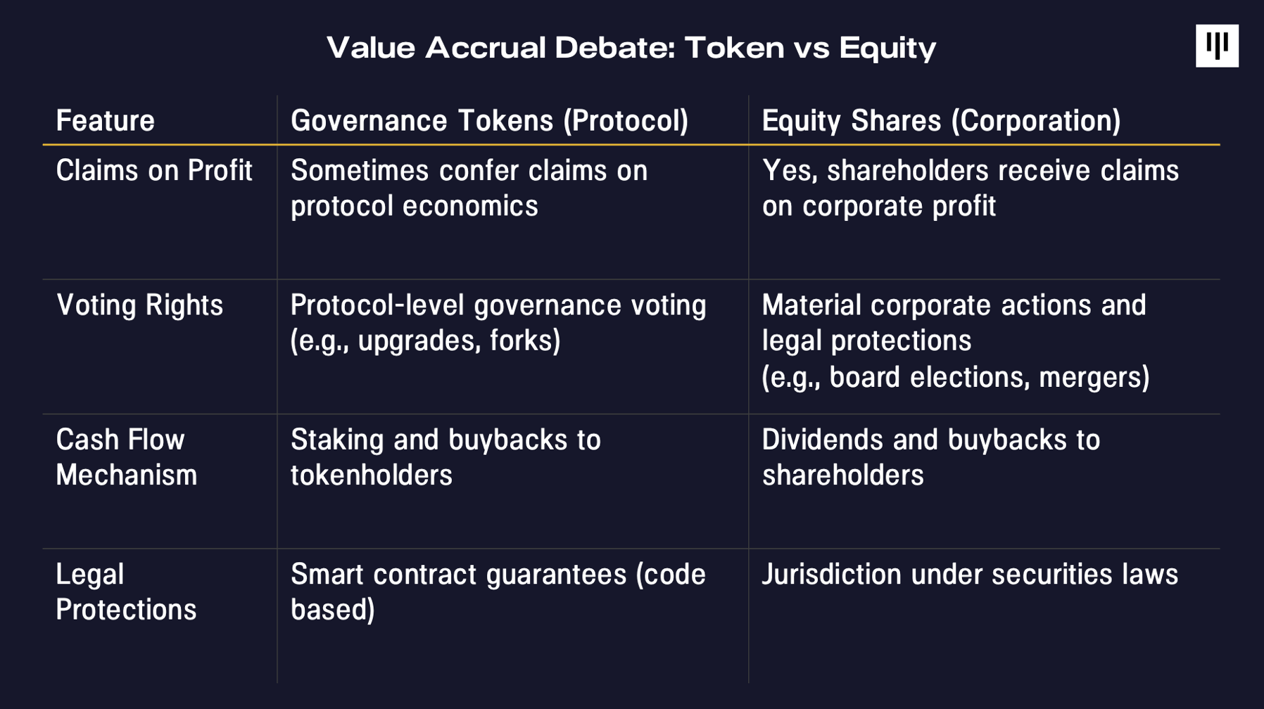 One of the most persistent challenges was the unresolved question around value accrual.  In traditional equity markets, shareholders benefit from clear legal claims on cash flows, governance, and residual value. Tokens, by contrast, often rely on protocol-level mechanisms enforced by code rather than by governmental body enforced law.