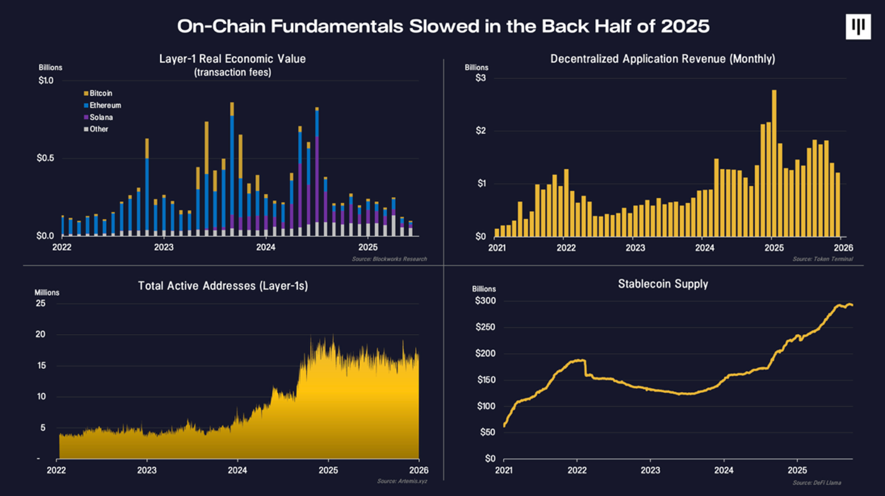 Across key indicators – including layer-one revenue, decentralized application fees, and active addresses – activity decelerated.  Stablecoin supply, notably, continued to grow, signaling ongoing adoption of blockchain for payments and settlement.  However, much of the economic value associated with stablecoins accrued to off-chain equity-based businesses rather than to token-based protocols.
