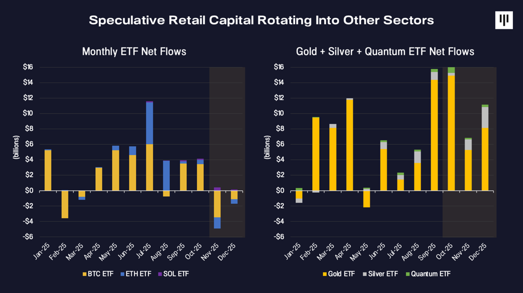 ETF inflows surged into gold, silver, and emerging thematic trades such as quantum computing, while digital asset ETF flows slowed and turned negative later in the year. This rotation occurred precisely as token breadth was deteriorating, reinforcing downside momentum.