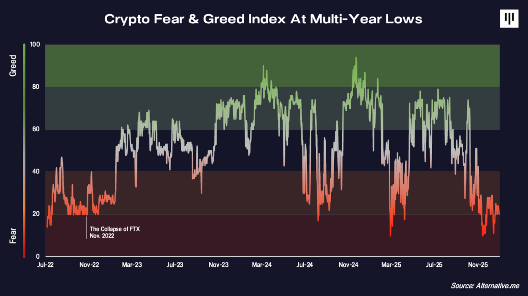 The Fear & Greed Index reached readings last seen during periods of acute stress, including the aftermath of the FTX collapse.  At the same time, perpetual futures funding rates declined, signaling reduced leverage and diminished speculative excess.