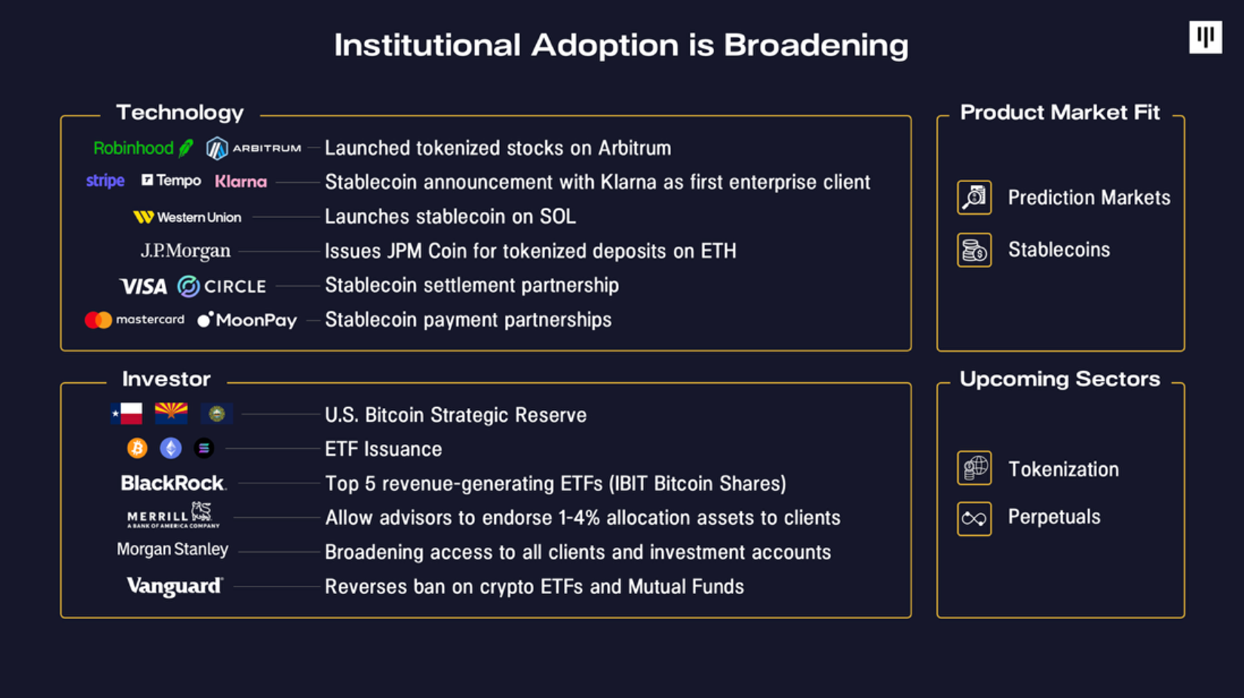 First, institutional adoption continues to broaden.  Enterprises are increasingly integrating blockchain into core products – from Robinhood launching tokenized equities to Stripe developing stablecoin infrastructure to JPMorgan tokenizing deposits.  On the capital side, sovereign reserves have been established, and wirehouses, retirement platforms, and large asset managers have meaningfully lowered barriers to participation.