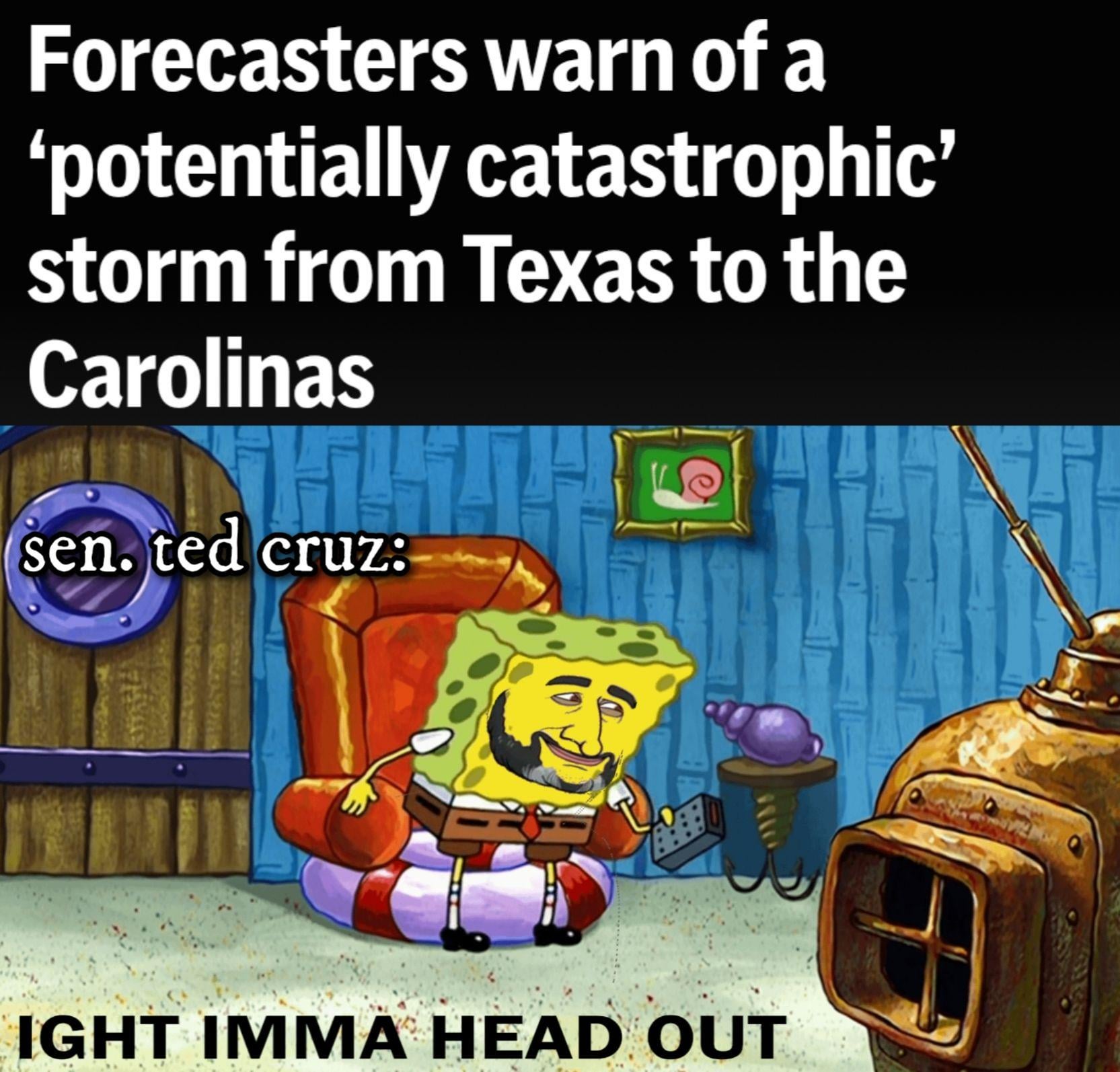 Eviewoodz on January 21, 2026 9:32 pm When the forecast says “catastrophic,” Ted hears “all-inclusive resort with free wi-fi and no constituents.”