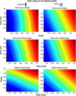 I like the implications of the chart on perceived fighting ability of a rival: “this guy’s reasonably tall.. but his penis is average at best.. I think I could take him”.. although, interestingly that affect is only when a rival is assessed online rather than in person.. go figure