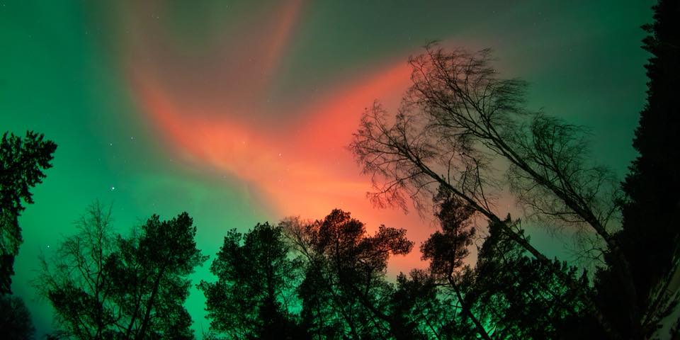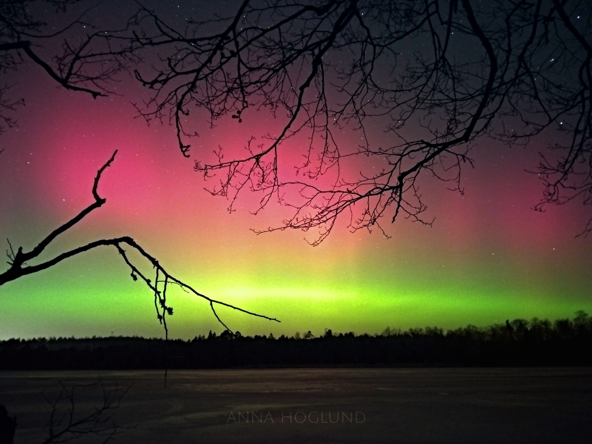 Anna Höglund, a Brit who now lives in Kilanda, 40km northeast of Gothenburg, took our winning photo, capturing the vibrant green and pink hues of the Aurora Borealis framed between the branches of trees.
