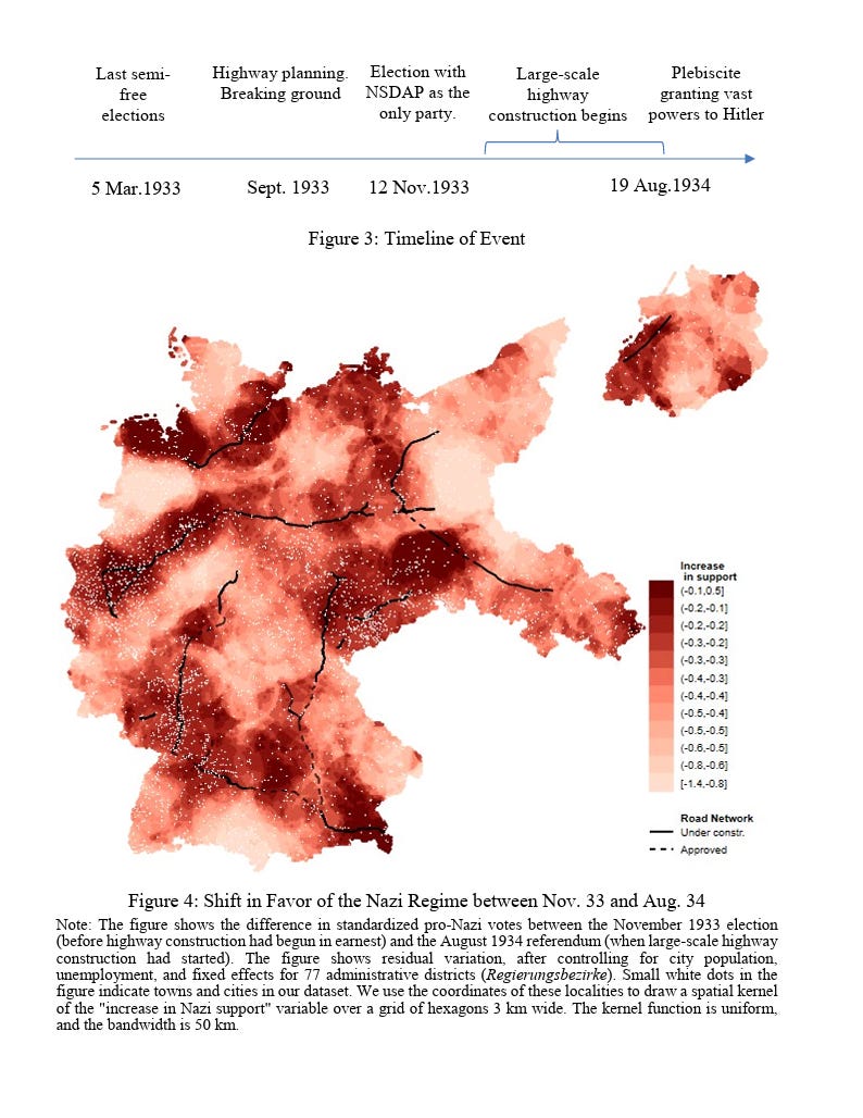 Can autocracies win electoral support by showcasing economic competence? We analyze a famous case – the building of the Autobahn network in Nazi Germany. Using newly collected data, we show that highway construction was effective in boosting popular support, helping to entrench the Nazi dictatorship. Direct economic benefits such as declining unemployment near construction sites are unlikely to explain the increase in pro-Nazi votes. In addition, Nazi propaganda used the Autobahn as a powerful symbol of successful economic policy, putting an effective end to austerity – so that many Germans credited the Nazi regime for the economic recovery. In line with this interpretation, we show that support for the Nazis increased even more where highway construction coincided with greater radio availability – a major source of propaganda. The effect of highways was also significantly stronger in politically unstable states of the Weimar Republic. Our results suggest that infrastructure spending can raise support for autocracy when voters are led to associate it with visible economic progress and an end to political instability.