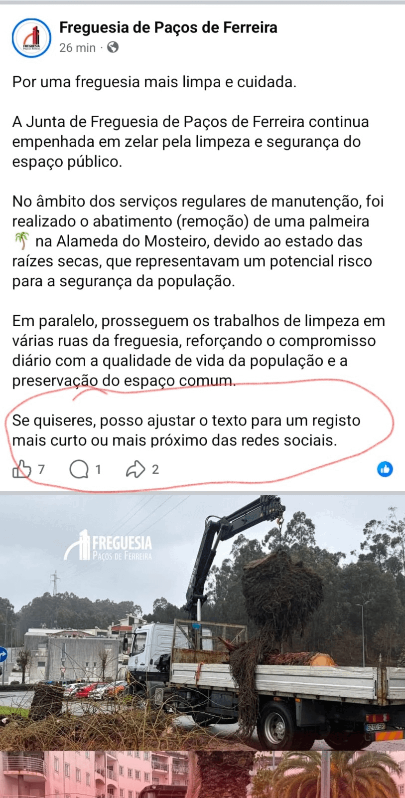 Chat, cria-me um post sobre remover uma palmeira morta para postar no facebook da freguesia.