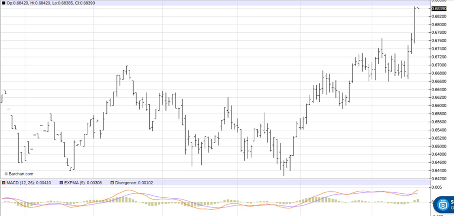 See on the daily bar chart for the March Australian dollar futures that prices are trending higher and have just hit a 15-month high. See, too, that the moving average convergence divergence (MACD) indicator is in a bullish mode as the blue MACD line is above the red trigger line and both lines are trending up. Bulls have the firm near-term technical advantage.
