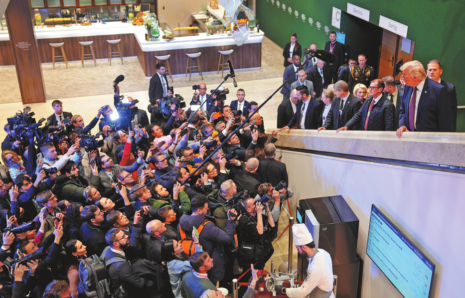 Journalists ask questions to US President Donald Trump (right), as he walks up a stairwell during the annual meeting of the World Economic Forum in Davos, Switzerland, on Thursday. Trump met with Ukrainian President Volodymyr Zelensky during the event on Thursday. EVAN VUCCI/AP