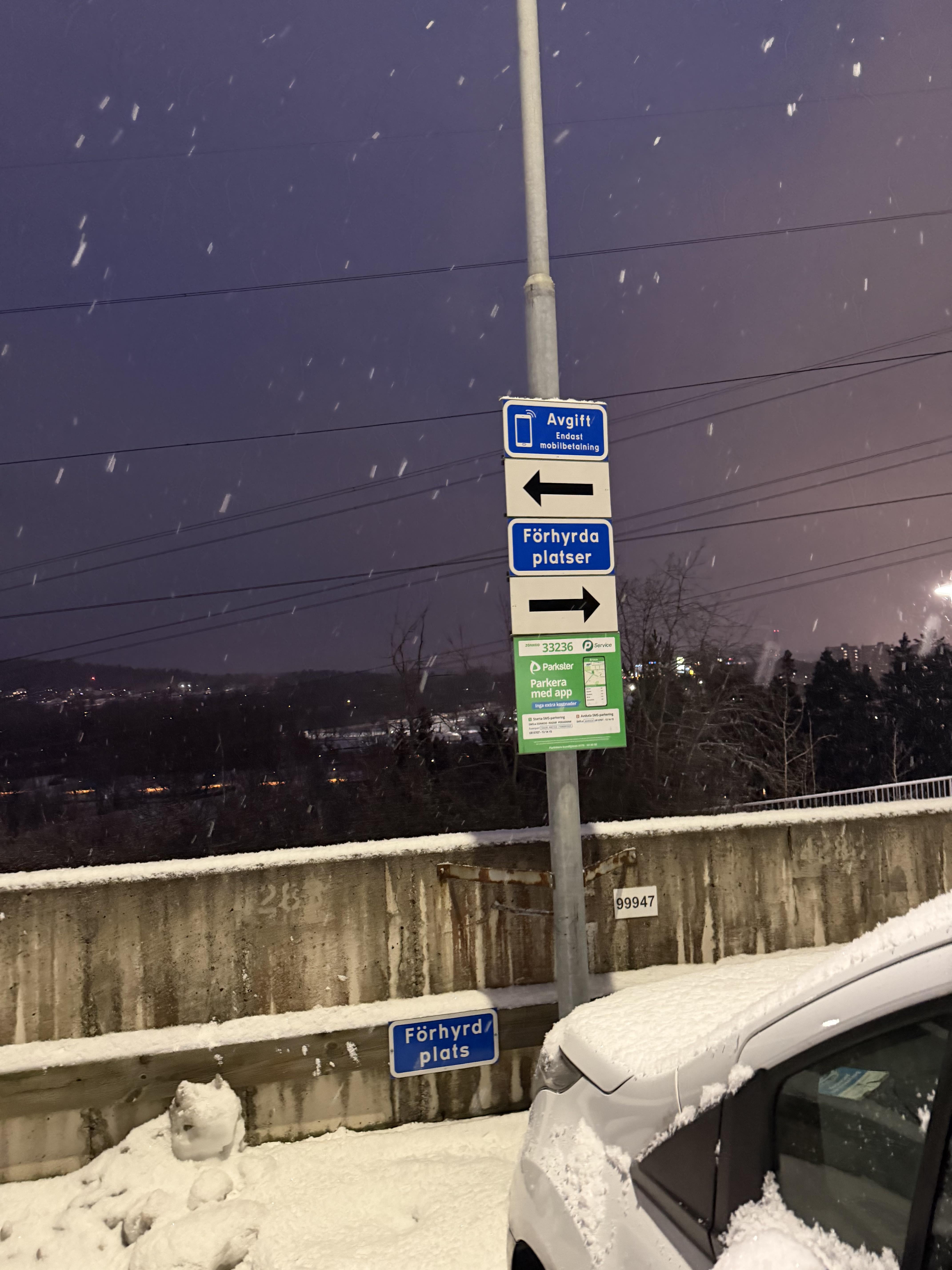 Det blir lite tvetydigt om stolpen står mitt i en ruta och det rutorna på marken som markerar platser. I så fall borde de satt upp en till skylt som hamnar mitt på en linje för när det snöar så kan man ju annars tro att man står rätt om man står halvt på en ruta.
