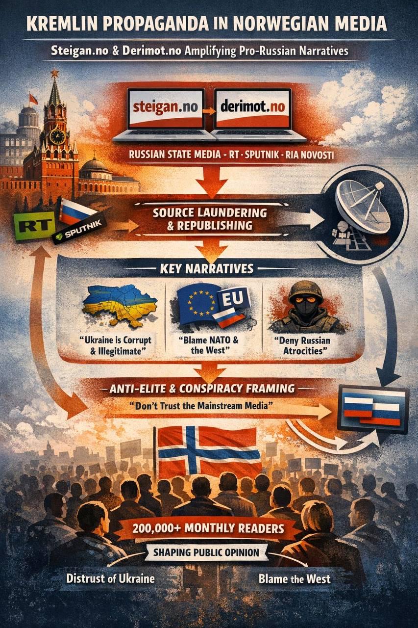 In Norway, pro-Russian propaganda doesn’t arrive with obvious Kremlin branding. It appears as confident headlines suggesting mainstream media is hiding the truth. Steigan.no and Derimot.no emerged as key distribution nodes for narratives that mirror Russia’s official messaging on Ukraine & Europe.