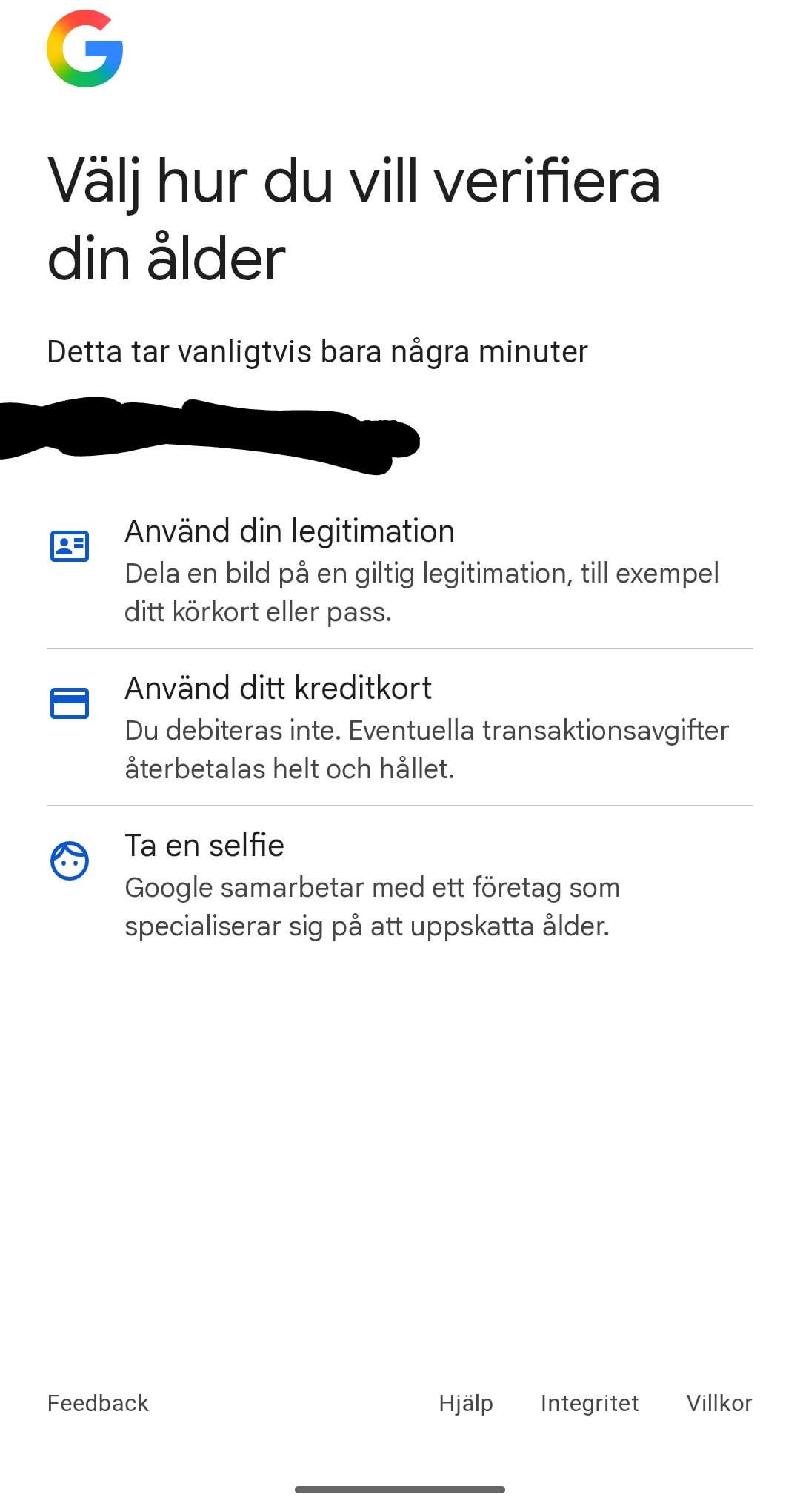 7. Hatar att verifiera men just att verifiera via betalkortet är smidigt, tumme upp till google för den. Kortet används redan hos dom för att köpa appar och mikrotransaktioner så känns som en mindre kränkning än att ladda upp leg/bilder.