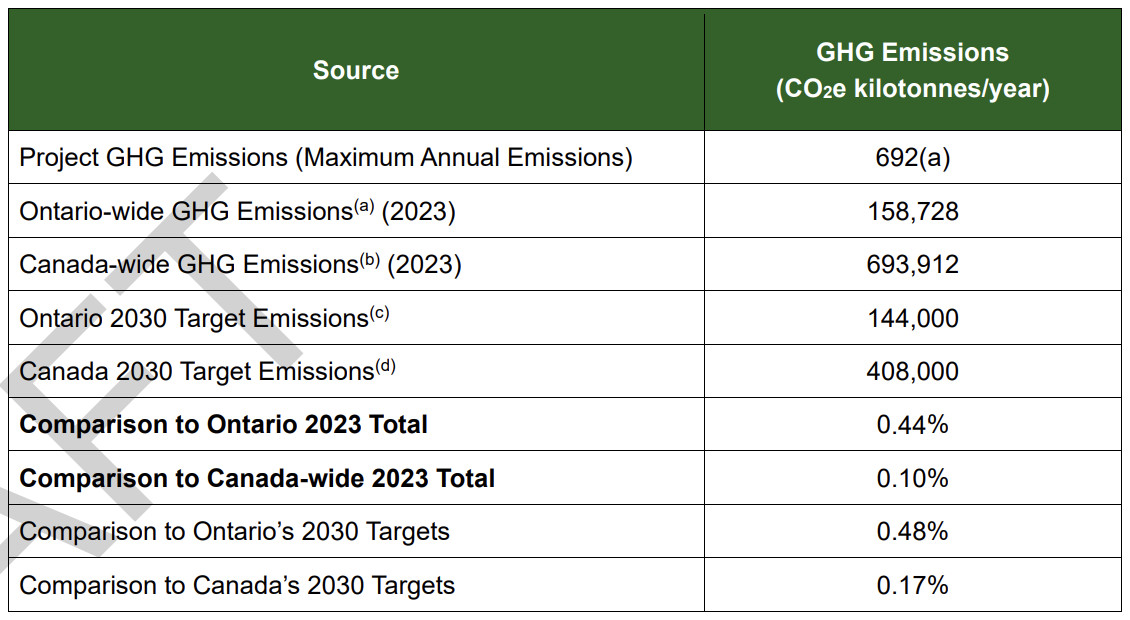 The draft compares the highway’s operational emissions to Ontario and Canada’s emissions reduction targets and concludes the project would contribute only 0.44 percent and 0.17 percent respectively.