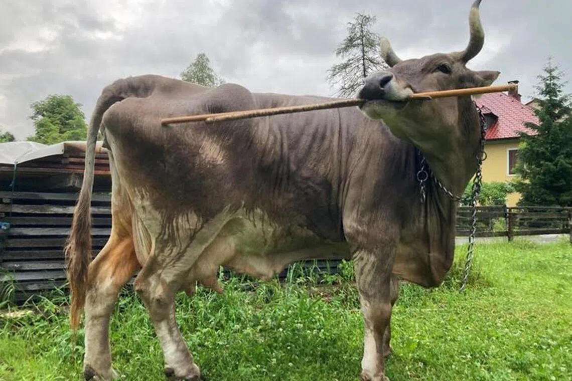 The 13-year-old Brown Swiss cow, named Veronika, is kept as a pet by Mr Witgar Wiegele, an organic farmer and baker living in the mountain village of Notsch in southern Austria.
