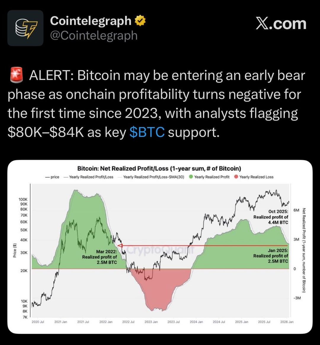 Bitcoin may be entering an early bear phase as onchain profitability turns negative for the first time since 2023, with analysts flagging $80K–$84K as key BTC support