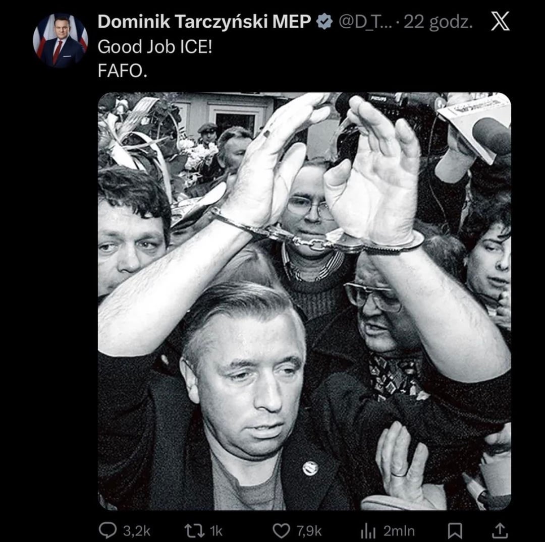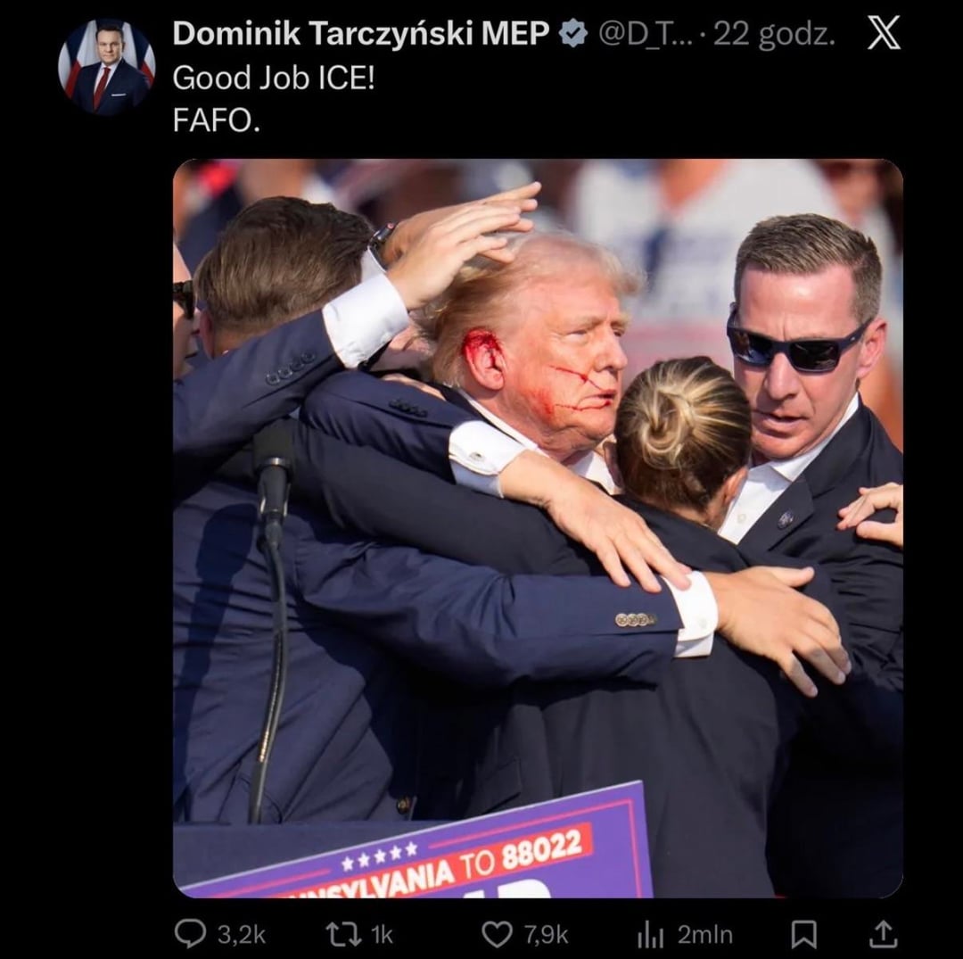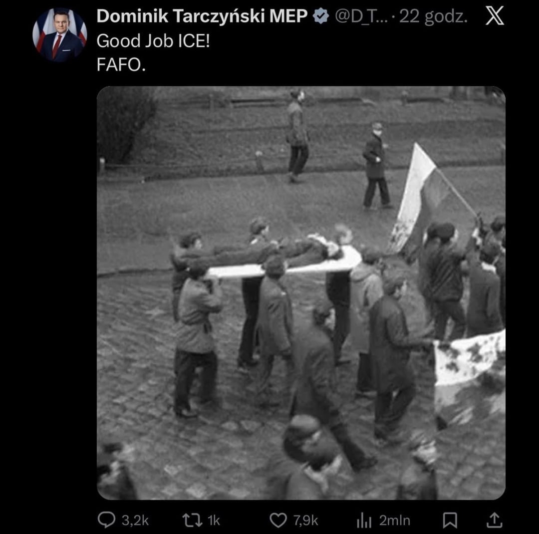 Jak dla mnie (zakładając że jest to prawdziwy post, nie mam X więc nie mogę zweryfikować) to interpretacja może być również taka, że zostały pokazane niewinne niczemu ofiary zamachów które walczyły w słusznej sprawie (jakakolwiek by ona nie była), a komentarz jest zwyczajnie ironiczny. Pan Tarczyński wręcz wyśmiewa ICE i sytuację która miała miejsce.