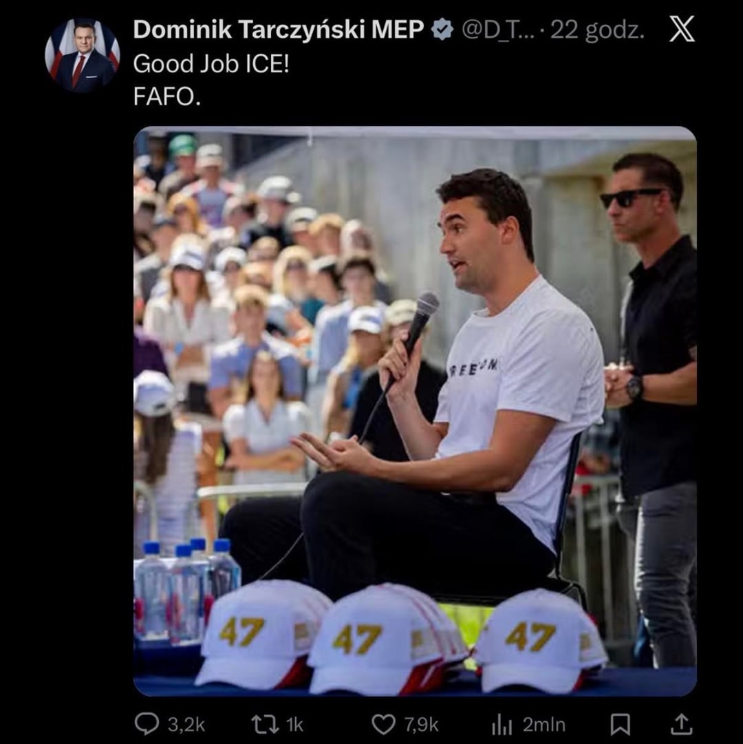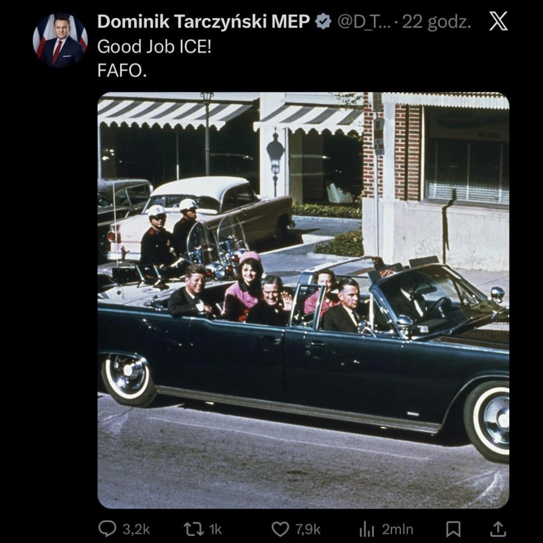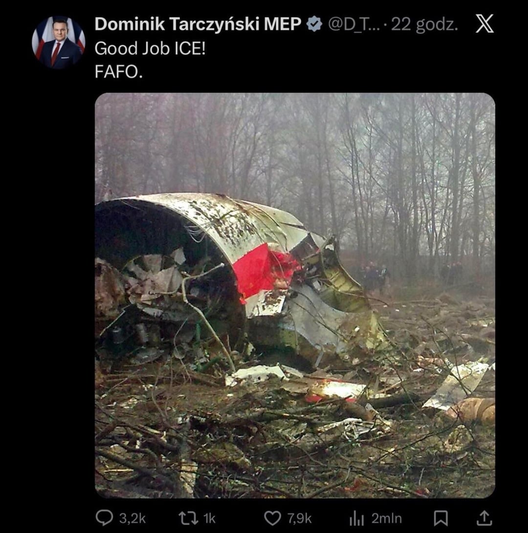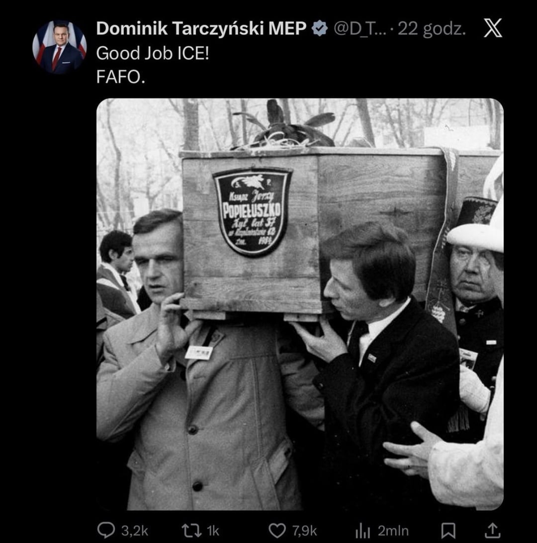 Jak dla mnie (zakładając że jest to prawdziwy post, nie mam X więc nie mogę zweryfikować) to interpretacja może być również taka, że zostały pokazane niewinne niczemu ofiary zamachów które walczyły w słusznej sprawie (jakakolwiek by ona nie była), a komentarz jest zwyczajnie ironiczny. Pan Tarczyński wręcz wyśmiewa ICE i sytuację która miała miejsce.