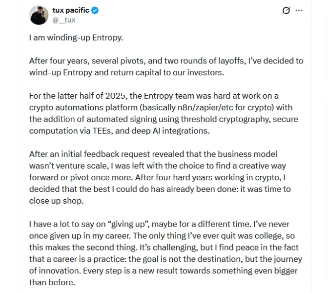 Entropy founder and CEO Tux Pacific posted to X on Saturday that the crypto automations platform doesn’t have a viable path forward after years of operation.