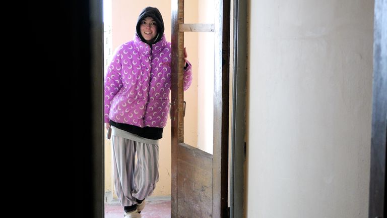 Dressed in a bright pink coat, Yeva, 23, is still living in her apartment with her boyfriend and their dog.