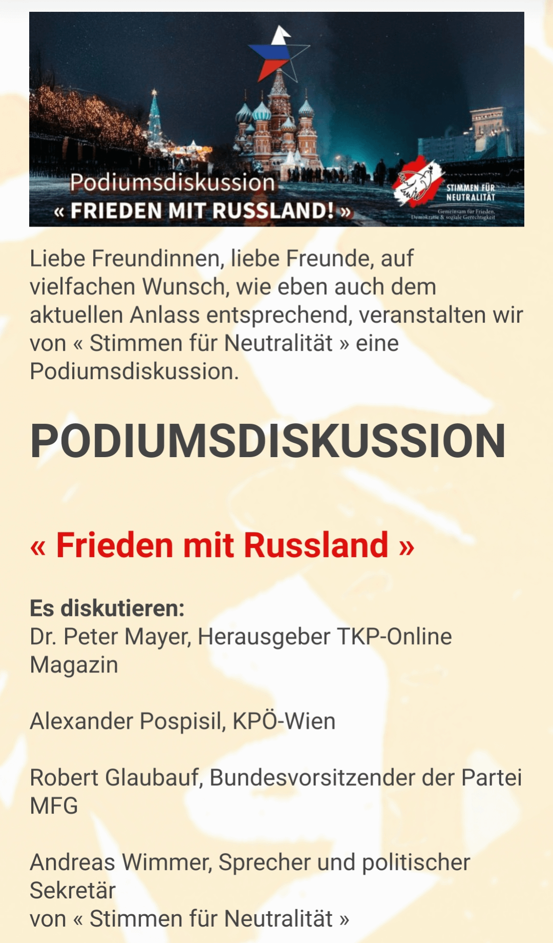 The speakers, as well as the discussion, should deal with the Western war in Ukraine against Russia and the associated comprehensive and far-reaching consequences.