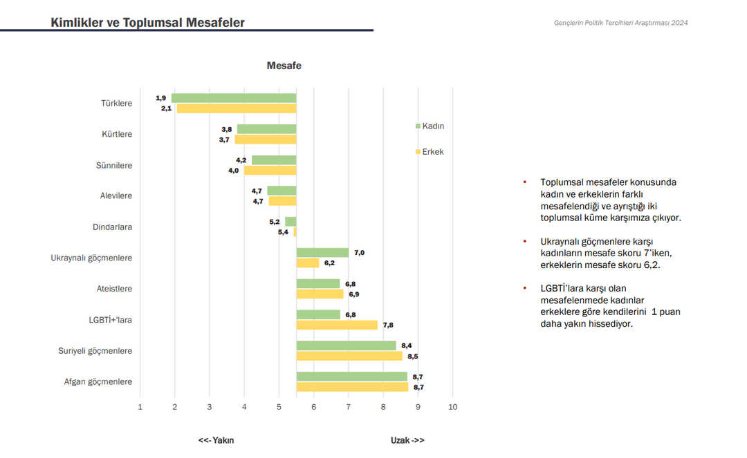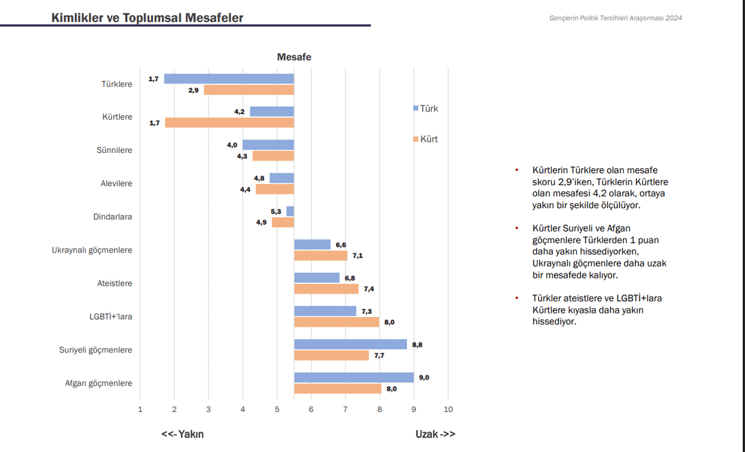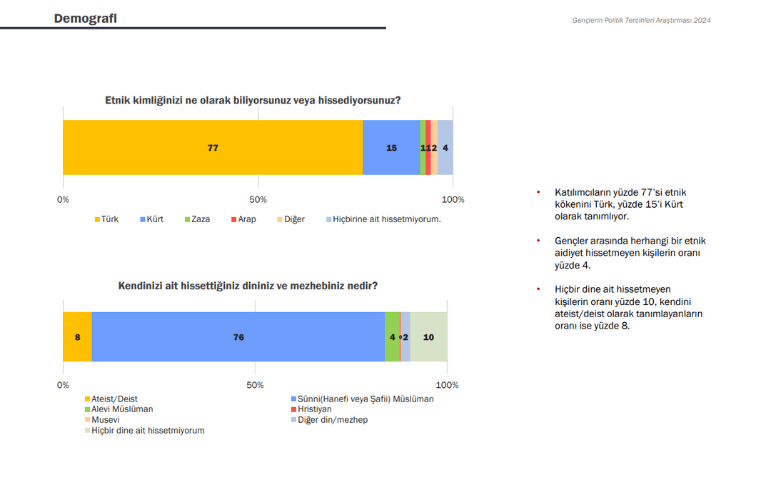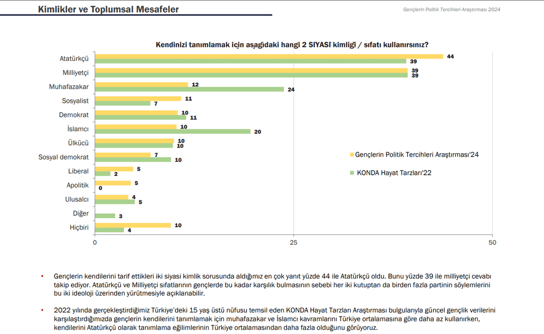 2- The next survey was conducted among young people between the ages of 18-30 in cooperation with GoFor and KONDA. While the rates of those who define themselves as Ataturkists and Socialists are on the rise, at 44% and 11% respectively, the decrease in the rates of Conservatives, Islamists and Social Democrats is noticeable. According to the survey, 77% of young people define themselves as Turkish and 15% as Kurdish. The survey also revealed that Kurds feel closer to the Turks than the Turks feel to the Kurds.