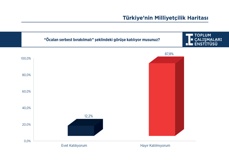 >Öcalan serbest bırakılmalı mı?” sorusuna katılımcıların %87,8’i “Hayır” yanıtını vermektedir. Bu yanıtı verenlerin oranı DEM Parti hariç tüm partilerde %91,5 ile %98,3 arasındadır. Atatürkçülerin %95,1’i Öcalan’ın serbest bırakılmasına karşı çıkarken sosyal demokratlarda karşı çıkma oranı %63’tür.
