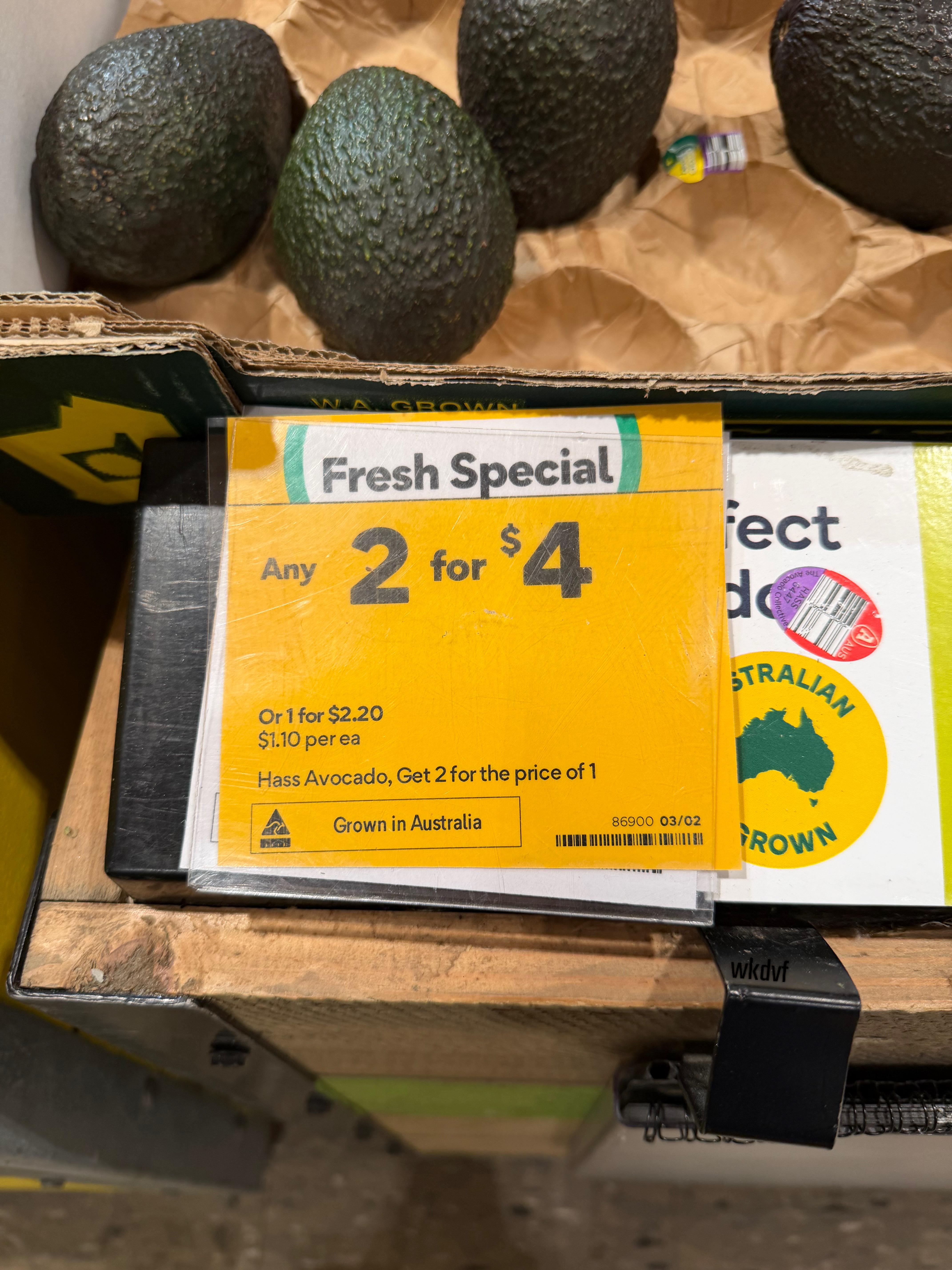 Two lots of two avocados is $4, two avocados are $2.20. If you only purchase two, the price per avocado is $1.10