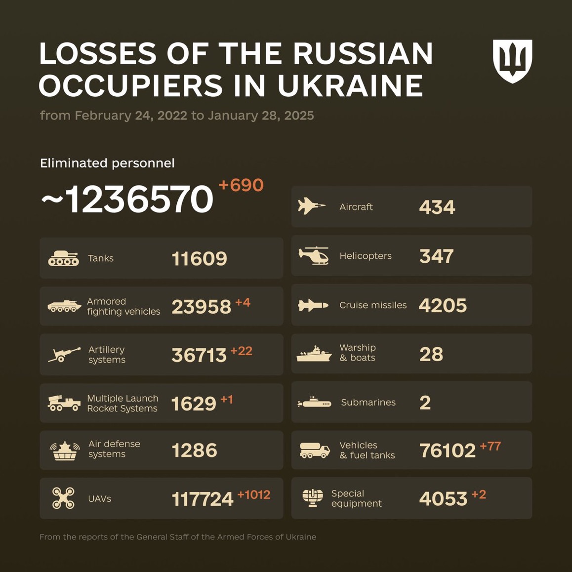 The General Staff of the Armed Forces of Ukraine has published a new summary of total combat losses of the enemy from 24.02.22 to 28.01.26. Find them in the infographics by the Ministry of Defense of Ukraine: