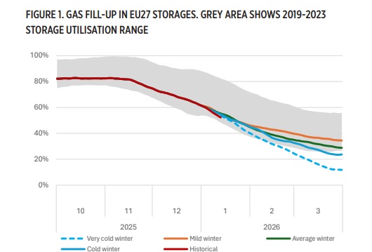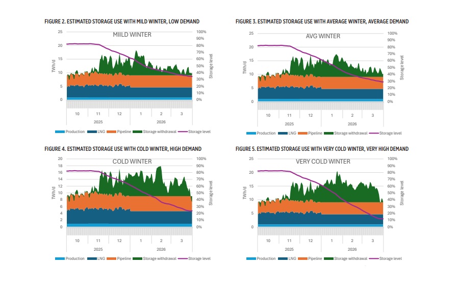The study outlines several scenarios for how Q1 2026 might unfold. The analysis warns that the combination of lower starting stocks and the coldest temperatures in 20 years could lead to storages being nearly depleted by the end of the winter.