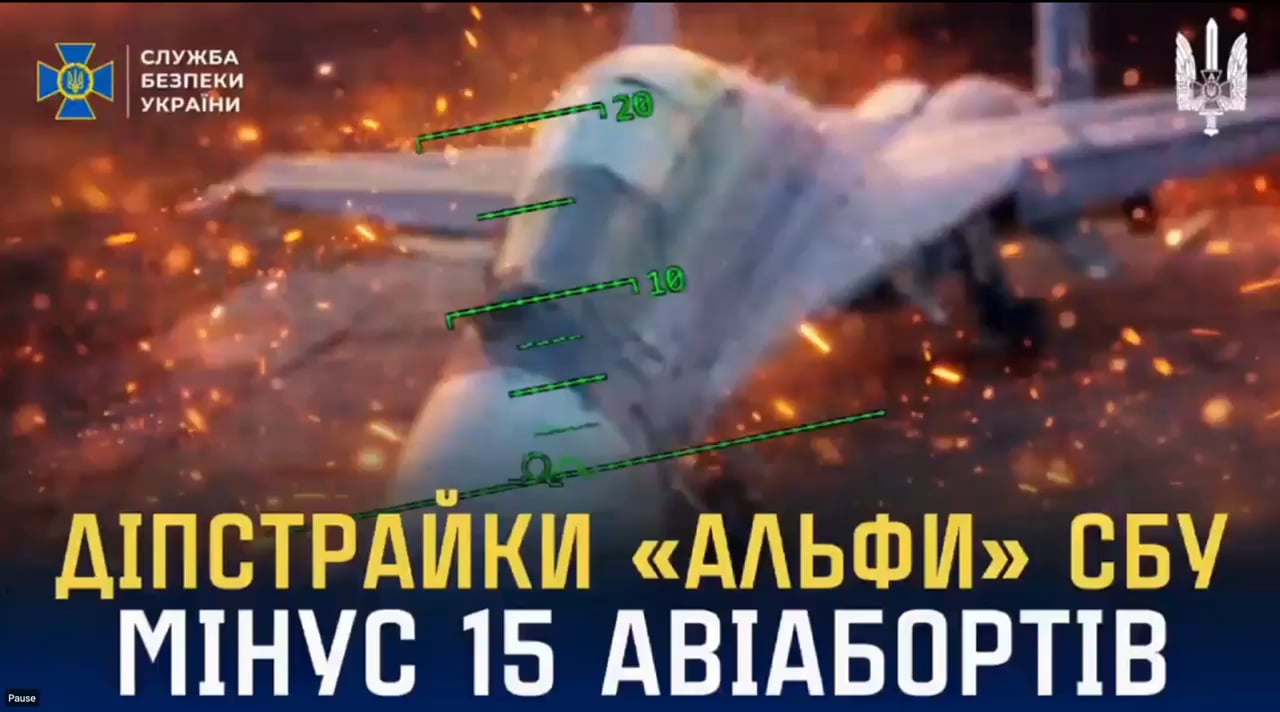 Security service of Ukraine conducted long-range drone strikes on five Russian military airfields deep in the rear. Targeting 15 aircraft: 11 fighters and bombers (Su-30SM, Su-34, Su-27, Su-24, MiG-31), three helicopters (Mi-28, Mi-26, Mi-8), and one transport aircraft (An-26).