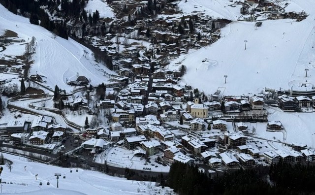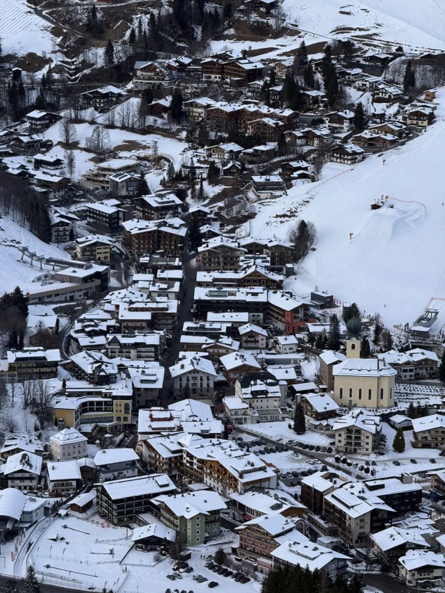 A view of the town of Saalbach from the ski descent under gondola A1. | Image: Brett Ploss